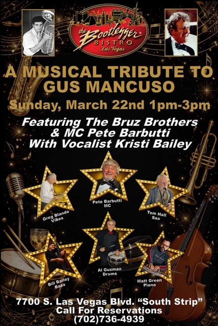 « All Events A Musical Tribute To Gus Mancuso – Bootlegger Bistro March 22 @ 1:00 pm - 3:00 pm « Amanda King and her Prohibition Three – Mob Museum Underground Rich Little – Copa Room at The Tuscany Casino » Add to calendar Google Calendar iCalendar Outlook 365 Outlook Live Details Date: March 22 Time: 1:00 pm - 3:00 pm Organizer Venue Venue Bootlegger Bistro 7770 S Las Vegas Blvd Las Vegas, 89123 United States + Google Map